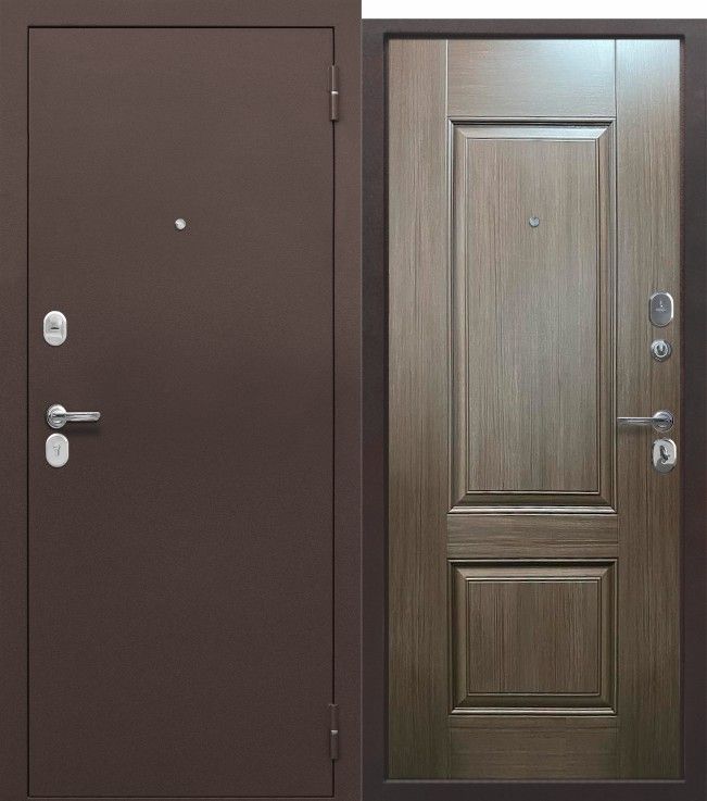 ПОКРЫТИЕ: внешнее: атмосферостойкое порошково-полимерное «Медный антик» внутреннее: меламиновая панель, цвет бежевый клен ЗАМКИ: Основной: цилиндровый Zirh Kilit (аналог KALE), диаметр ригелей: 16 мм, вылет ригелей: 35 мм Дополнительный: сувальдный Zirh Kilit (аналог KALE), диаметр ригелей: 16 мм, вылет ригелей: 35 мм Декоративный накладки на оба замка Независимая ночная задвижка Толщина дверного полотна: 70 мм Наполнитель: минеральная плита, плотность 70 кг/м3 Уплотнитель: 2 контура уплотнителя из вспененной резины Ручка: раздельная, цвет - хром Глазок: широкого обзора, цвет - хром Петли: 2 шт., наружные, открывание 180° Противосъём: штыри, 3 шт.